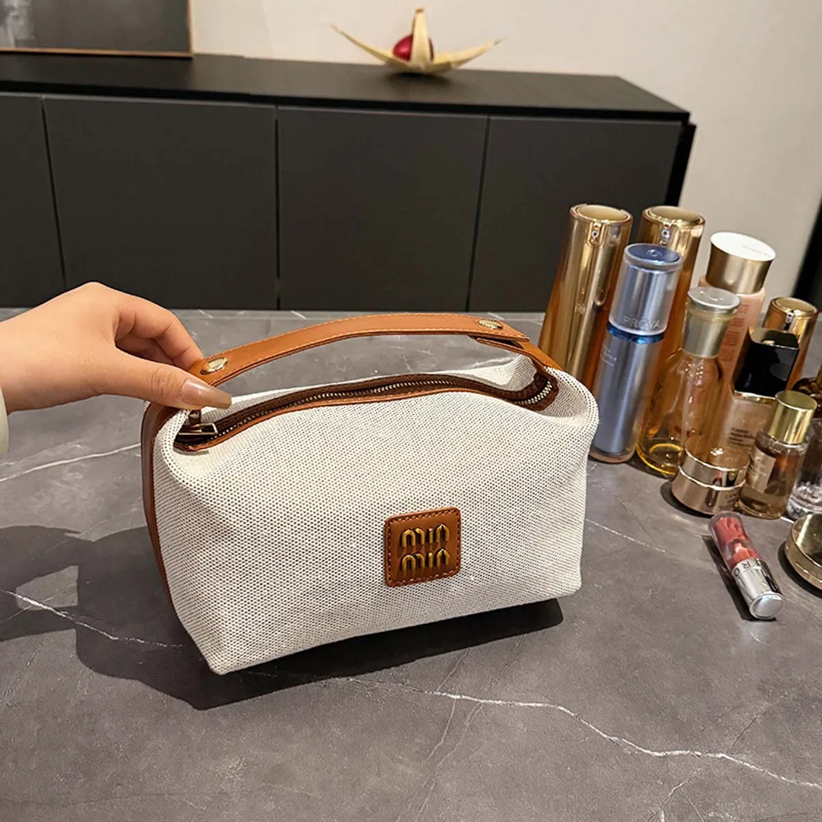 - حقيبة مستحضرات تجميل قماش راقٍ يمنح الحقيبة مظهرًا فخمًا ومتينا.