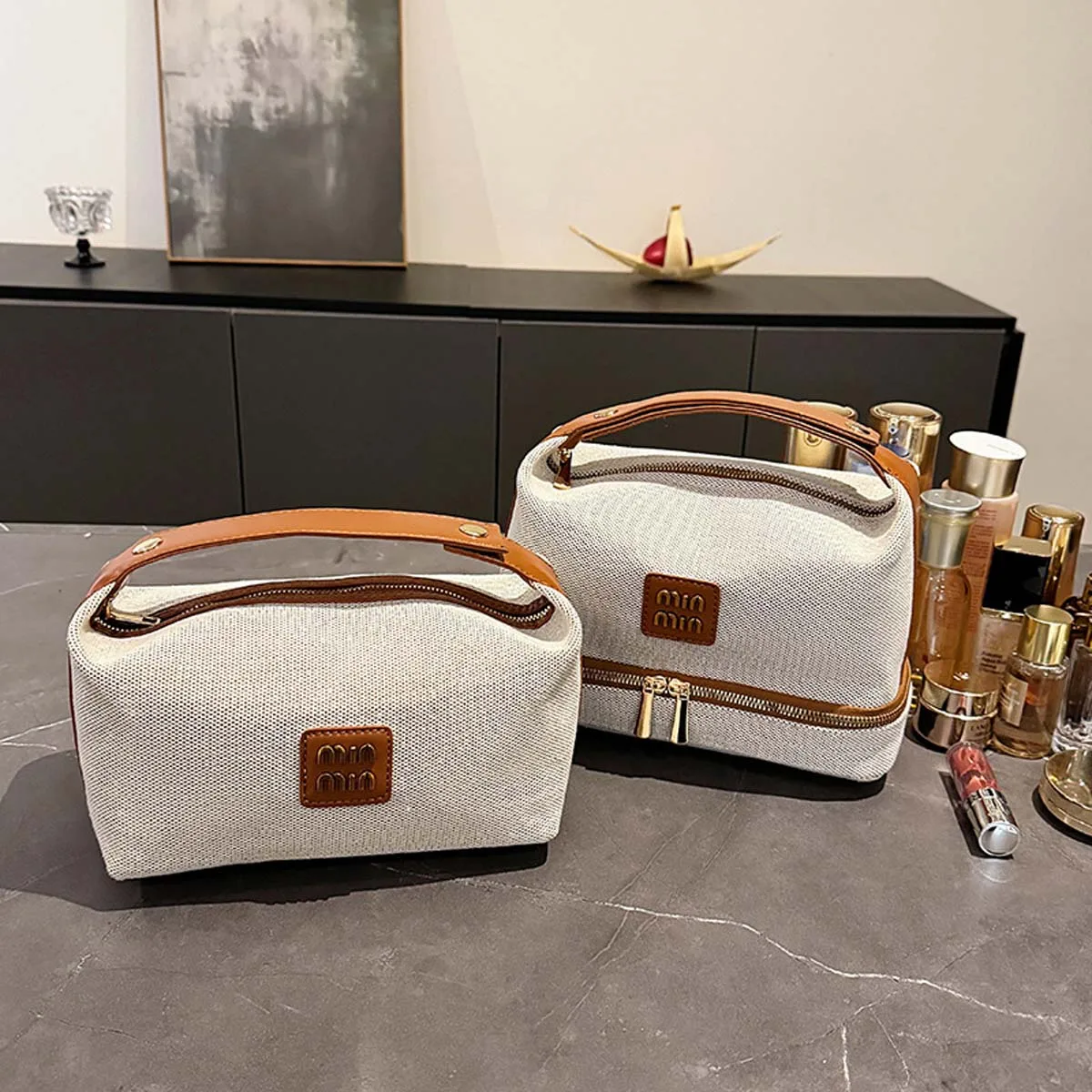 شنطة ماكياج تتميز بطبقة مزدوجة بتصميم أنيق وعصري من قماش قديم فخم، مع علامة معدنية راقية تضفي لمسة فاخرة، لتخزين مستحضرات التجميل وتنظيمها بسهولة أثناء التنقل.
