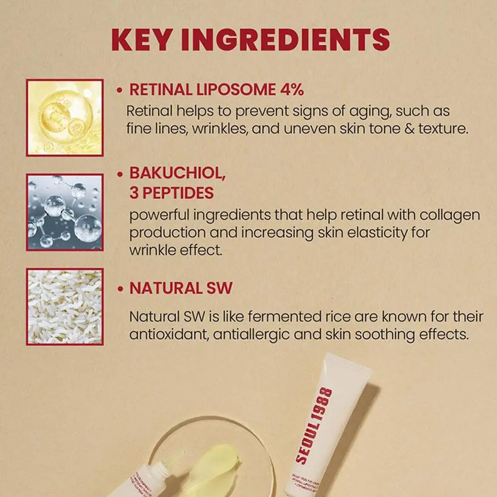 1.غني بتركيز عالٍ من الريتينول، فهو يقلل بشكل فعال من الخطوط الدقيقة والهالات السوداء، ويستعيد إشراقة الشباب.