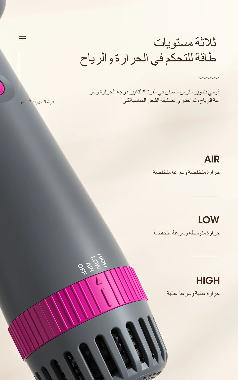 6.3 إعدادات للحرارة (منخفضة إلى متوسطة إلى عالية) لمرونة التصفيف، وأكثر راحة، ونحافة، ويد أكثر راحة، وضوضاء أقل.